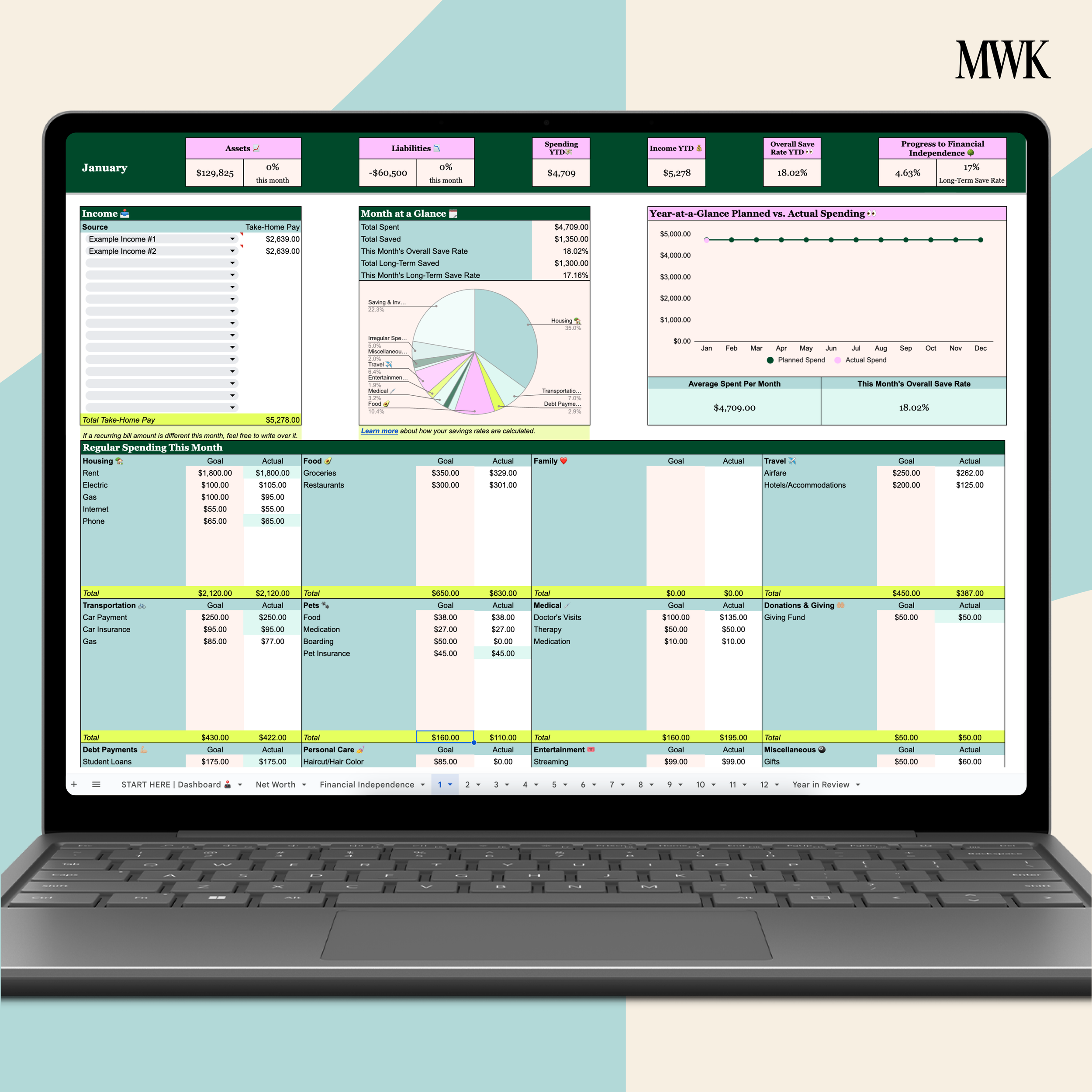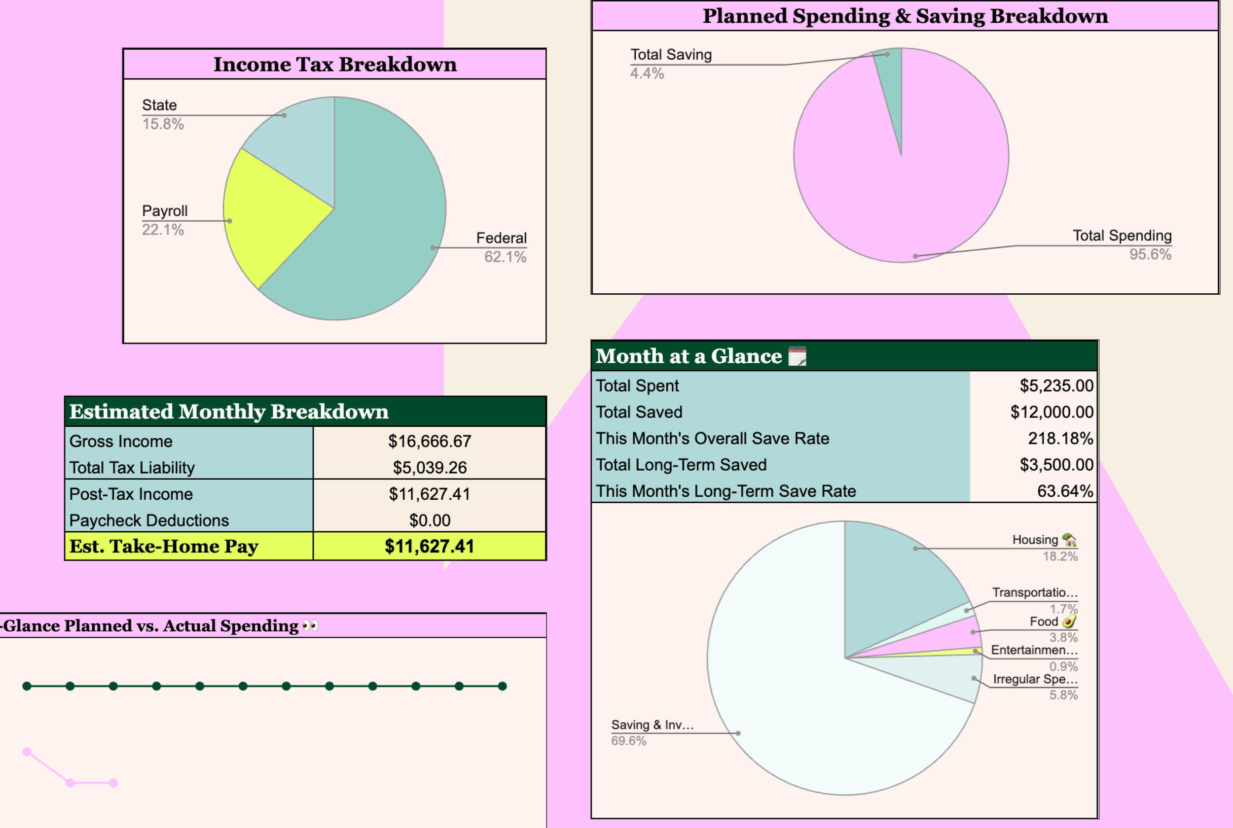 ✔️ A comprehensive dashboard to enter income, your spending plan, assets, liabilities, and saving and investing goals