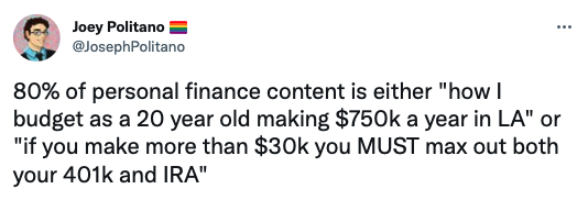 (This is also why it cracks me up when anonymous accounts make snarky comments on my content along the lines of, “Ha, so your money advice is just to work more?” Well…yes. That is typically how one earns more, but I digress. Welcome to Late Stage Capitalism—I’ll be your host!)