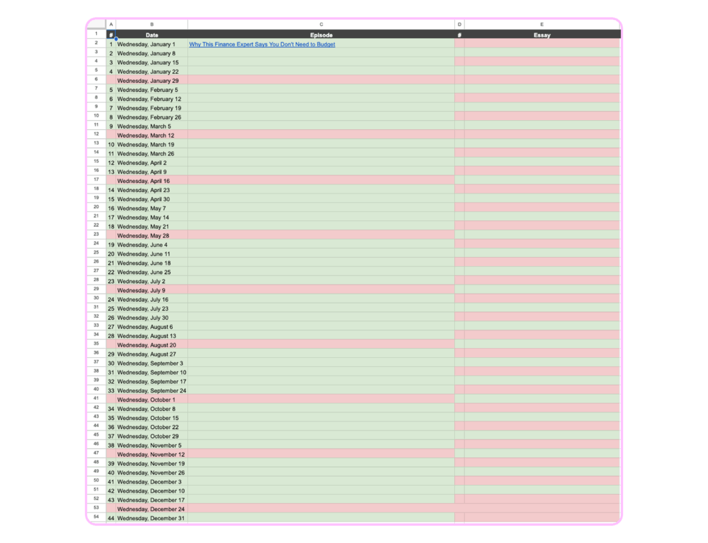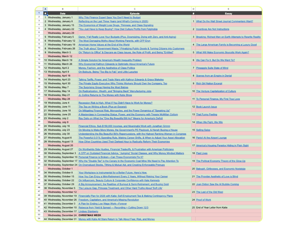 I’ve had this letter planned since the first quarter of 2025, but now that it’s time to write it, I have no idea how to do so without going blind from gazing too intently at my own navel. (Nevertheless, she persisted.) At the start of this year, I color-coded a blank editorial calendar. Every empty green cell represented an idea I’d need to bring to life in audio or print.