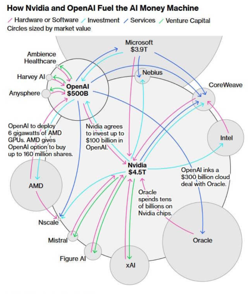 Booming or not, the fundamentals of this gold rush leave something to be desired. OpenAI is, according to the magic of the market, “worth” $500 billion, despite its mere $12 billion in revenue. Nvidia, a company that makes chips, is somehow worth more than the entire pharmaceutical industry combined. A recent Bloomberg visualization of these companies’ financial interdependencies, which would appear to show a rat king of incestuous funding, offers little in the way of clarity about the true source of the demand or value: